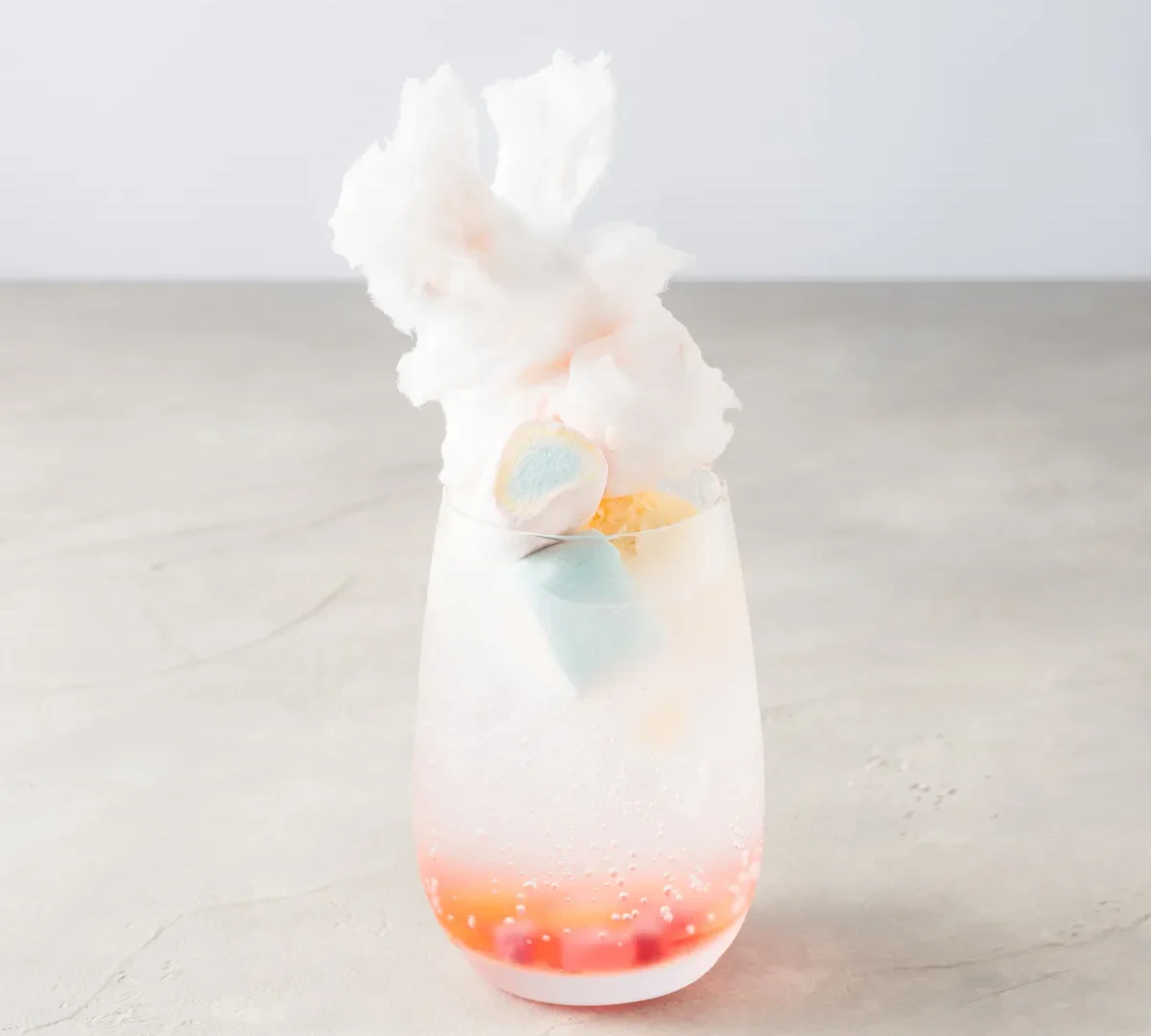 - グラスに氷、《Giffard》バブルガムシロップ、ジェリービーンズを入れる。