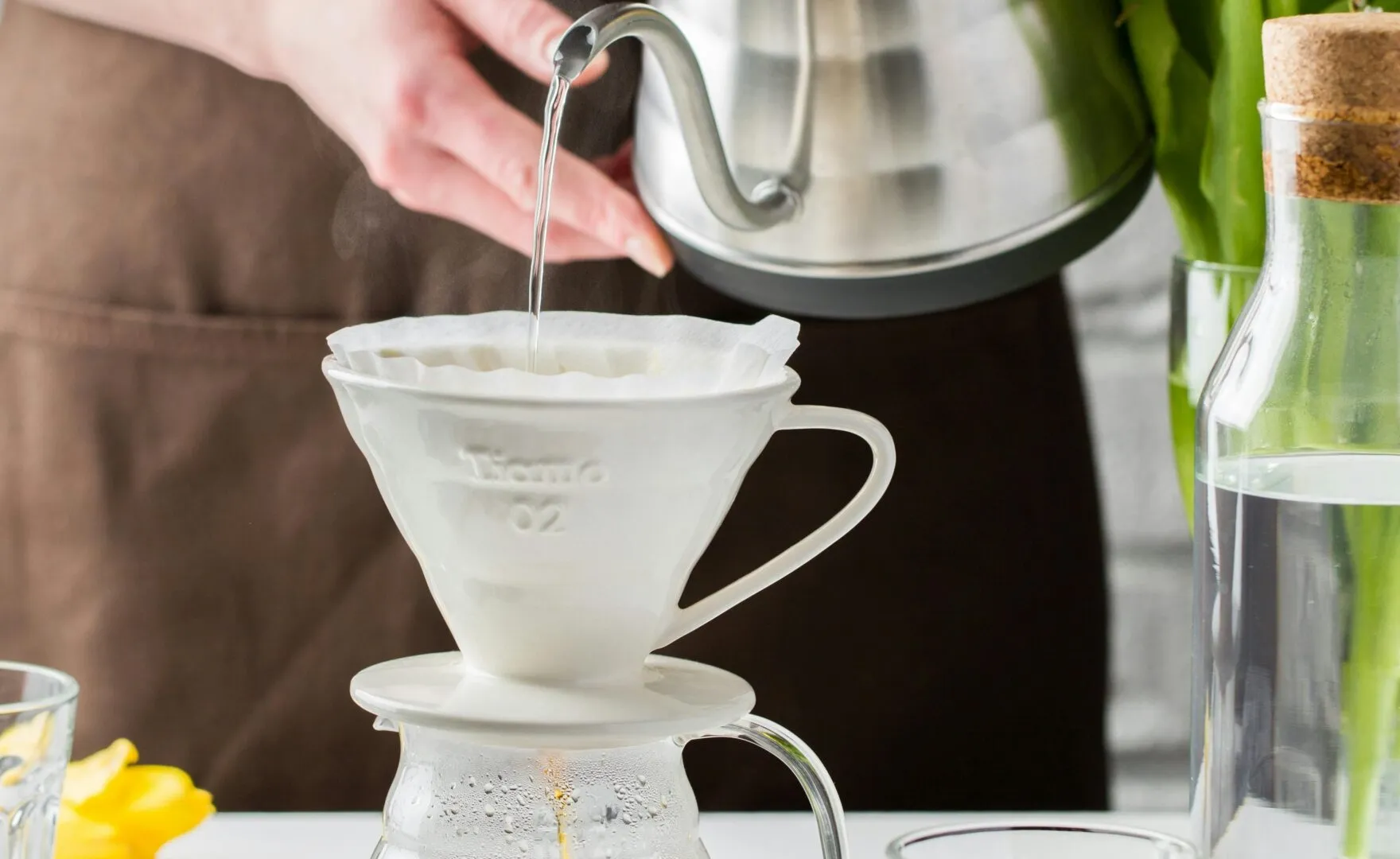 次に、重要な工程が「ペーパーリンス」です。フィルターの上から、ドリッパー全体を温めるようにお湯を回しかけます。これには、①紙の匂いを取り除く、②ドリッパーを温める、③フィルターを器具に密着させるという3つの大切な役割があります。サーバーに落ちたお湯は、内部に残った紙の匂いごと洗い流すように捨てましょう。